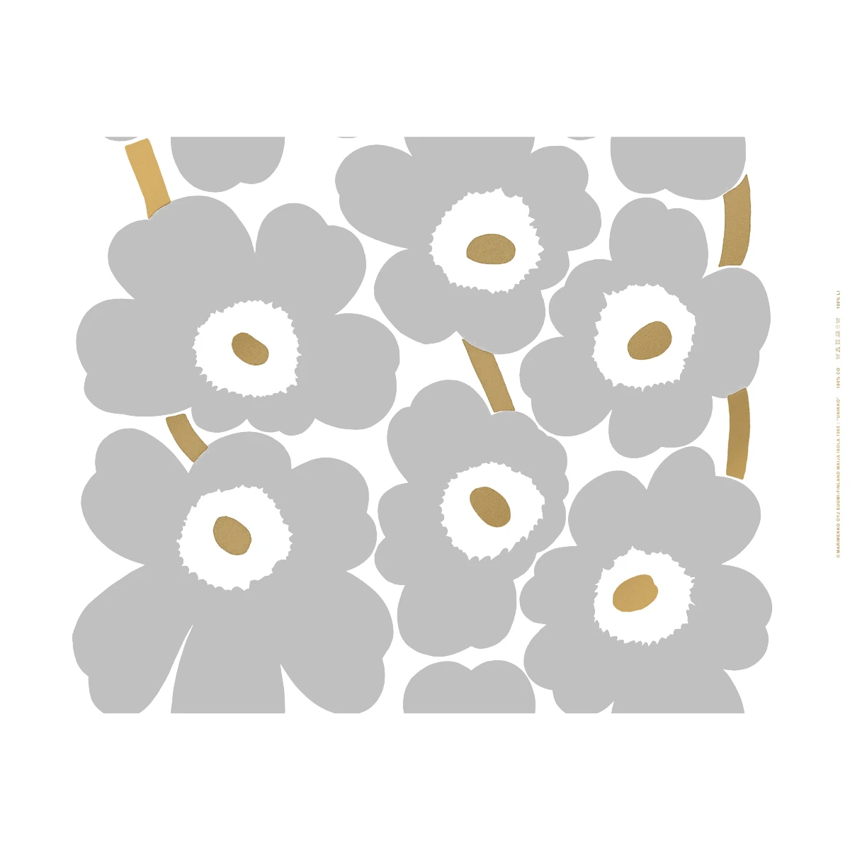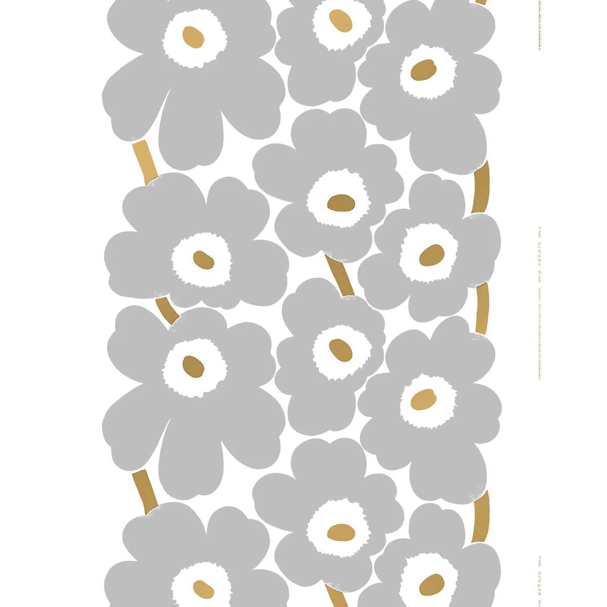 Printed on 100% cotton sateen, this Marimekko fabric has just a little extra sheen and shimmer for the holiday season. It has a wintry yet modern colorway to match with tones of snow white, grey, and glistening gold. Made in Finland, use this heavyweight fabric for table linens, wall hangings, curtains, and more.