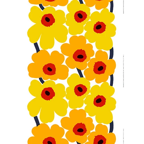 An icon of fifty years, Maija Isola’s prized poppy pattern is as peppy as ever on the Marimekko Unikko Yellow/Red PVC Fabric. Petals of yellow and a tangy tangerine surround blazing red centers, all warm hues that are perfectly paired with modest navy stems. Surround yourself with this sunny color scheme and feel your days brighten; easy to clean, PVC makes for a great tablecloth, high chair cover or placemats. Still printed in Finland on 100% coated cotton, this beautiful fabric will only cause your love for Unikko to grow.