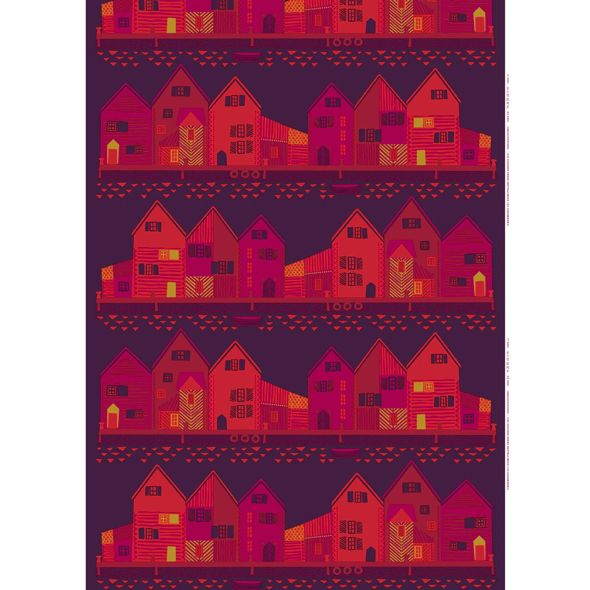 The coziest and most colorful neighborhood awaits you with the Marimekko Vanhakaupunki Plum/Red Fabric. Designed by Sanna Annukka, this bold and beautiful little townscape is filled with deep reds and purples, peppered with bright yellow lights and windows. Great as a tablecloth, wall hanging or duvet cover, this pattern feels like home. Made of 100% organic cotton, Vanhakaupunki is machine washable.
