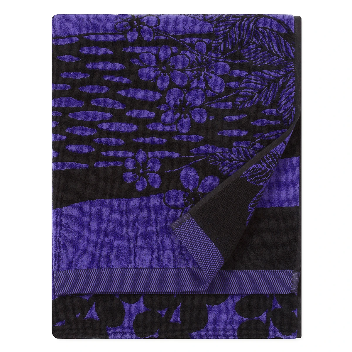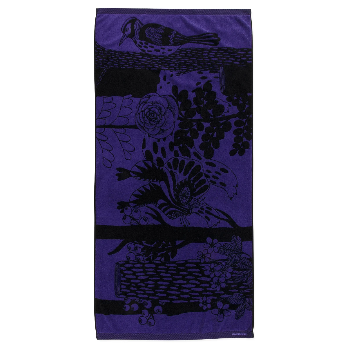 Maija Louekari’s 2017 Veljekset pattern celebrated Finland’s 100th anniversary of independence and has been brought back this year in striking jewel tones like this studding shade of violet. Inspired by Finnish folk tales, it artfully depicts the wildlife that inhabits the northern country. It is featured on a 100% cotton terry bath towel, which is lightweight enough to be fast-drying while also being very absorbent. It has an attached loop for hanging when not in use.