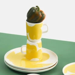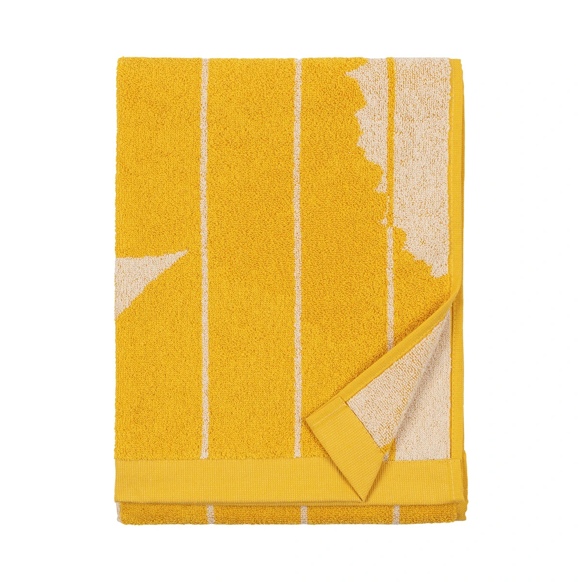 The year 2024 marks the 60th anniversary of Unikko (Poppy), one of the most recognized Marimekko print designs in the world. To celebrate, this unique take on the famous poppies combines two of designer Maija Isola’s patterns in a vibrant yellow and beige colorway. Called Vesi Unikko, the poppies are blown up in size and almost abstract, while the delicate Vesi (water) pattern represents Marimekko’s legacy of iconic stripes. Hung atop a towel ring or towel bar, this Marimekko Vesi Unikko hand towel sets a lively scene in the bath with its vibrant and celebratory poppies. The 100% organic cotton terry hand towel is fluffy, absorbent and machine washable, including a hanging loop on one side.