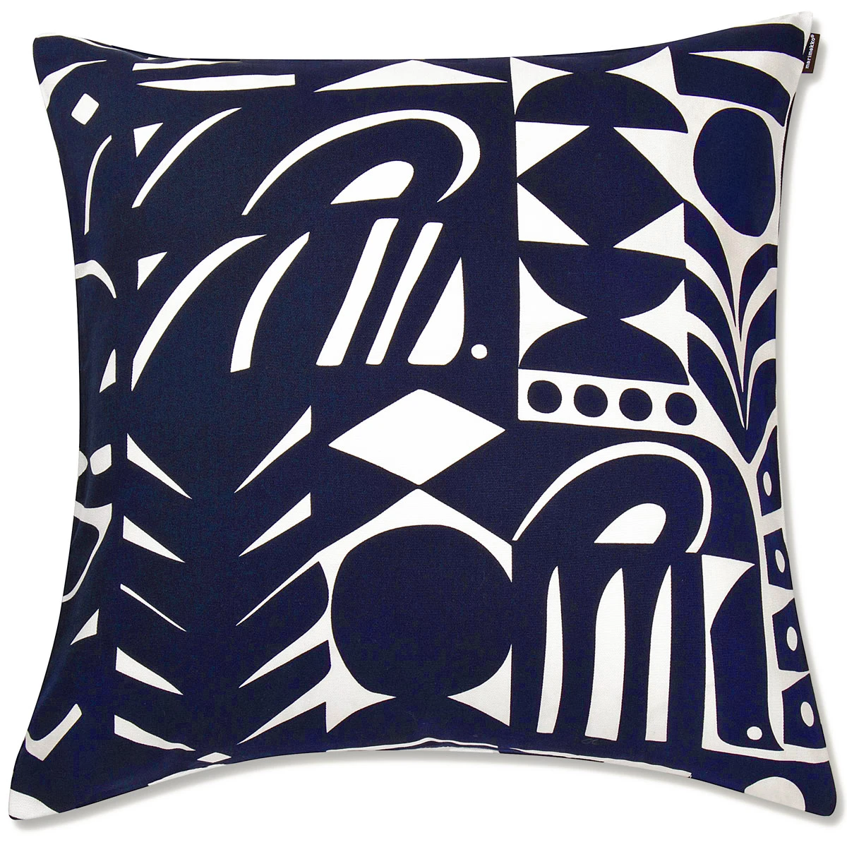 The bold geometric shapes in white and dark blue on the Marimekko Yon Varjo Large Throw Pillow will spice up any seating area. A side zipper allows it to be removable from a pillow insert and then machine washed.