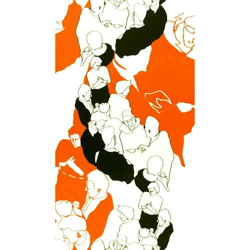 The Marimekko Ystävät fabric design, Finnish for “Friend,” by Maija Louekari in 2004, illustrates a line of people in an ess-shape. With black, pale mint green and orange, Louekari creates a beautiful arrangement of space and tonal range.This fabric is sold by repeat only. Enter desired number of repeats in the Repeats box. If you order more than one repeat, they will remain intact.